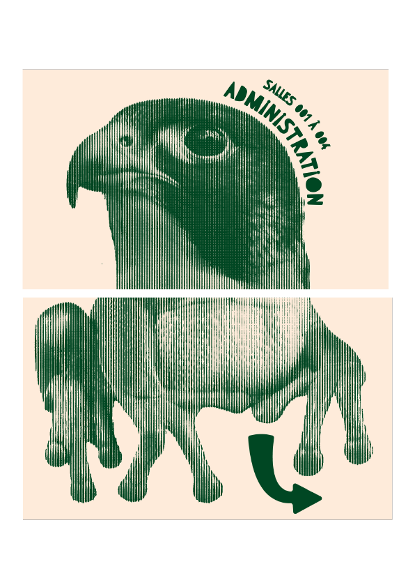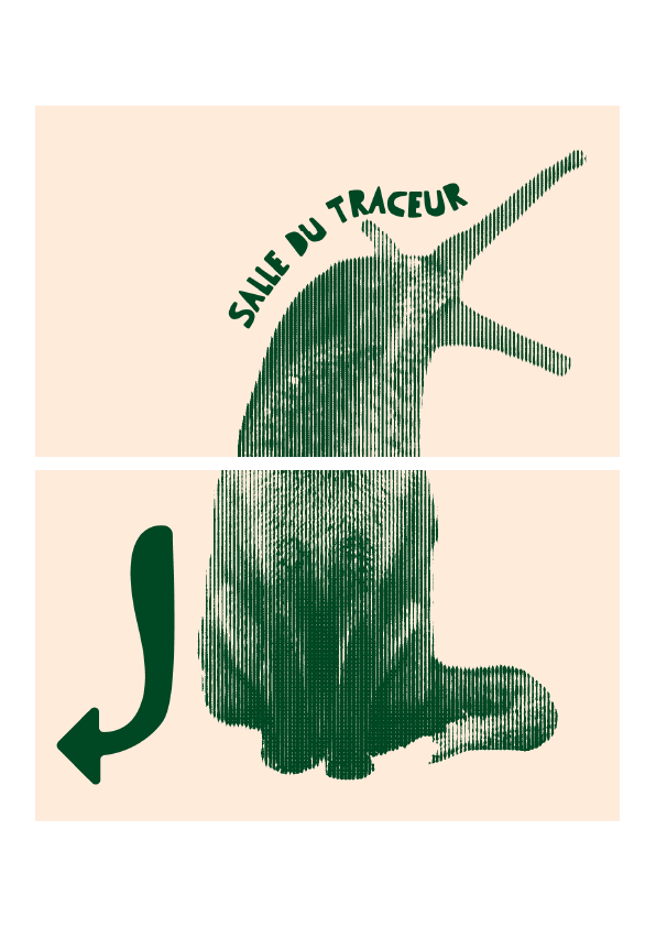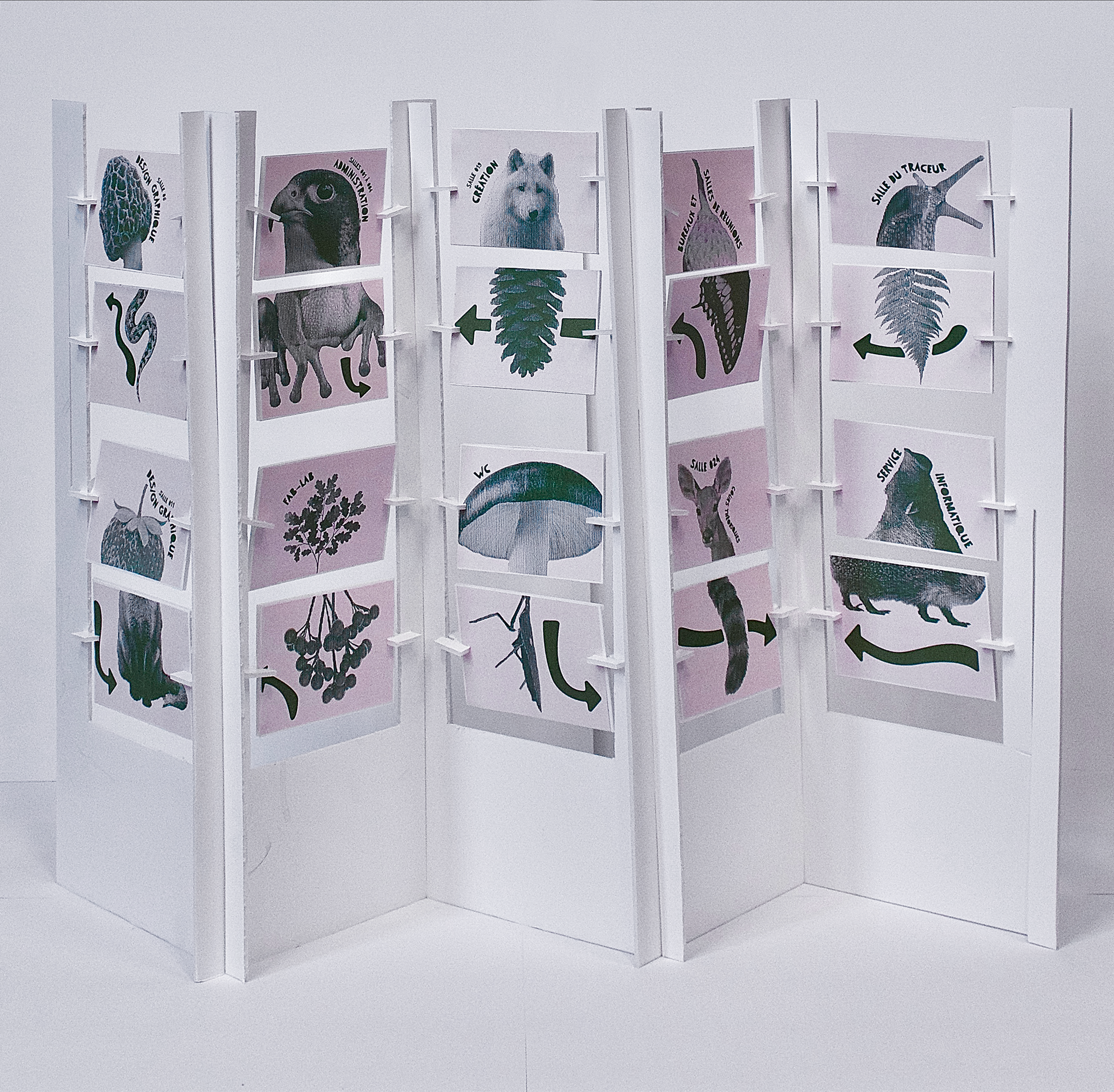 Ce projet de signalétique visait à revoir l'espace de notre école, en proposant une nouvelle signalétique originale qui occuperait l'espace du rez-de-chaussée. Avec Iris Elkeslassy, nous avons eu l'idée de transformer cet espace en forêt. Nous pensions qu'il était bien trop blanc et vide pour des étudiants en design Graphique ! À Partir de là, nous avons conçu un système d'affichage modulable avec des panneaux déclinés : Les panneaux du bas sont destinés à indiquer la direction, et ceux du haut l'endroit ou la salle désigné. De cette façon, si une salle venait à changer d'emplacement, nous n'avions qu'à changer la direction en changeant le panneau du bas. Tout ce système reposait sur un paravant avec des encoches.